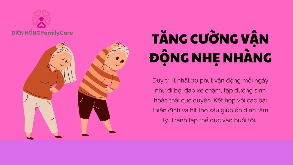 Duy trì ít nhất 30 phút vận động mỗi ngày như đi bộ, đạp xe chậm, tập dưỡng sinh hoặc thái cực quyền.